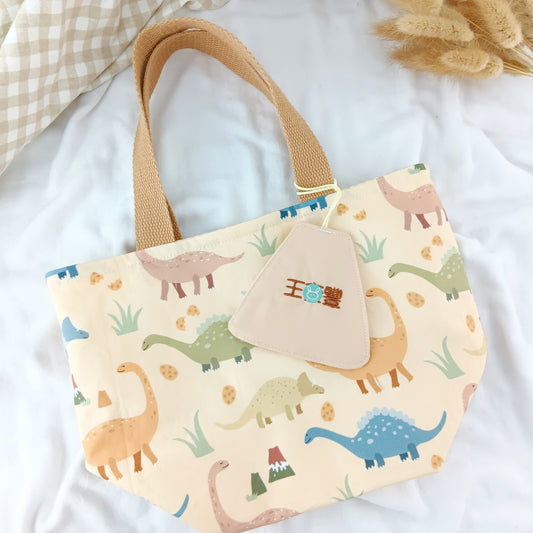 附姓名吊牌。莫蘭迪恐龍。幼兒園小學適用 可機洗束口便當袋 餐袋