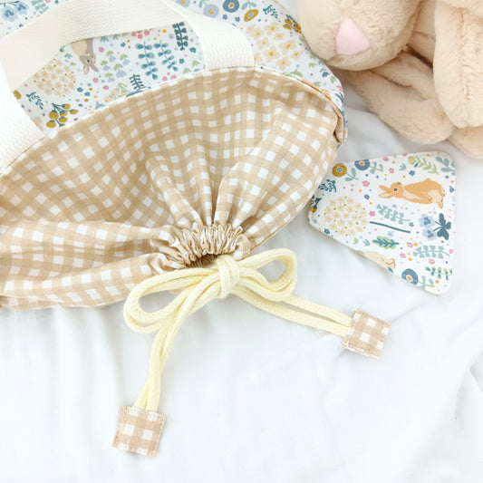 附姓名吊牌。兔兔花園。幼兒園小學適用 可機洗束口便當袋 餐袋