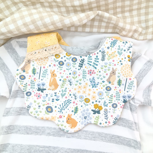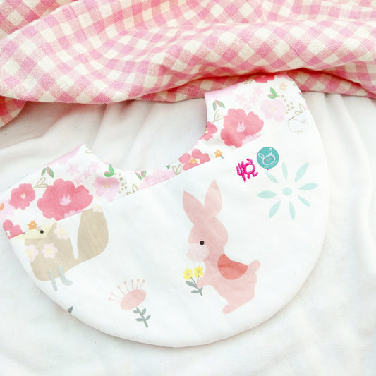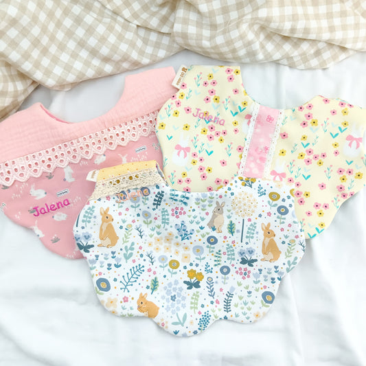 可繡名字。都是兔兔3件組。設計款蕾絲花型圍兜口水巾彌月組