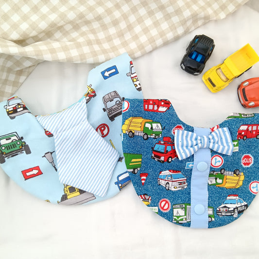 可繡名字。都是車車2件組。小紳士設計款圍兜口水巾彌月組