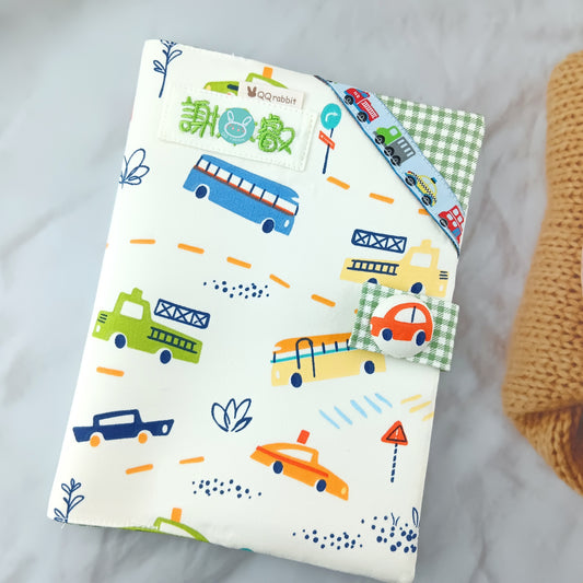 免費繡名字。米白底車車。寶寶手冊布書衣