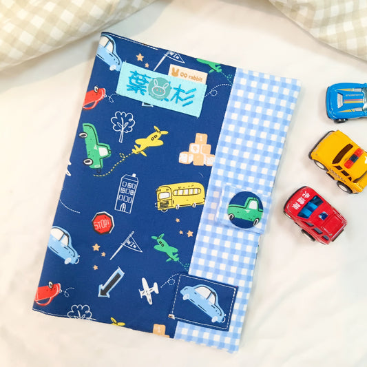 免費繡名字。深藍底車車。寶寶手冊布書衣