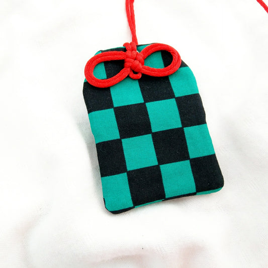 動漫風綠黑格紋。御守款平安符袋 (可繡名字)
