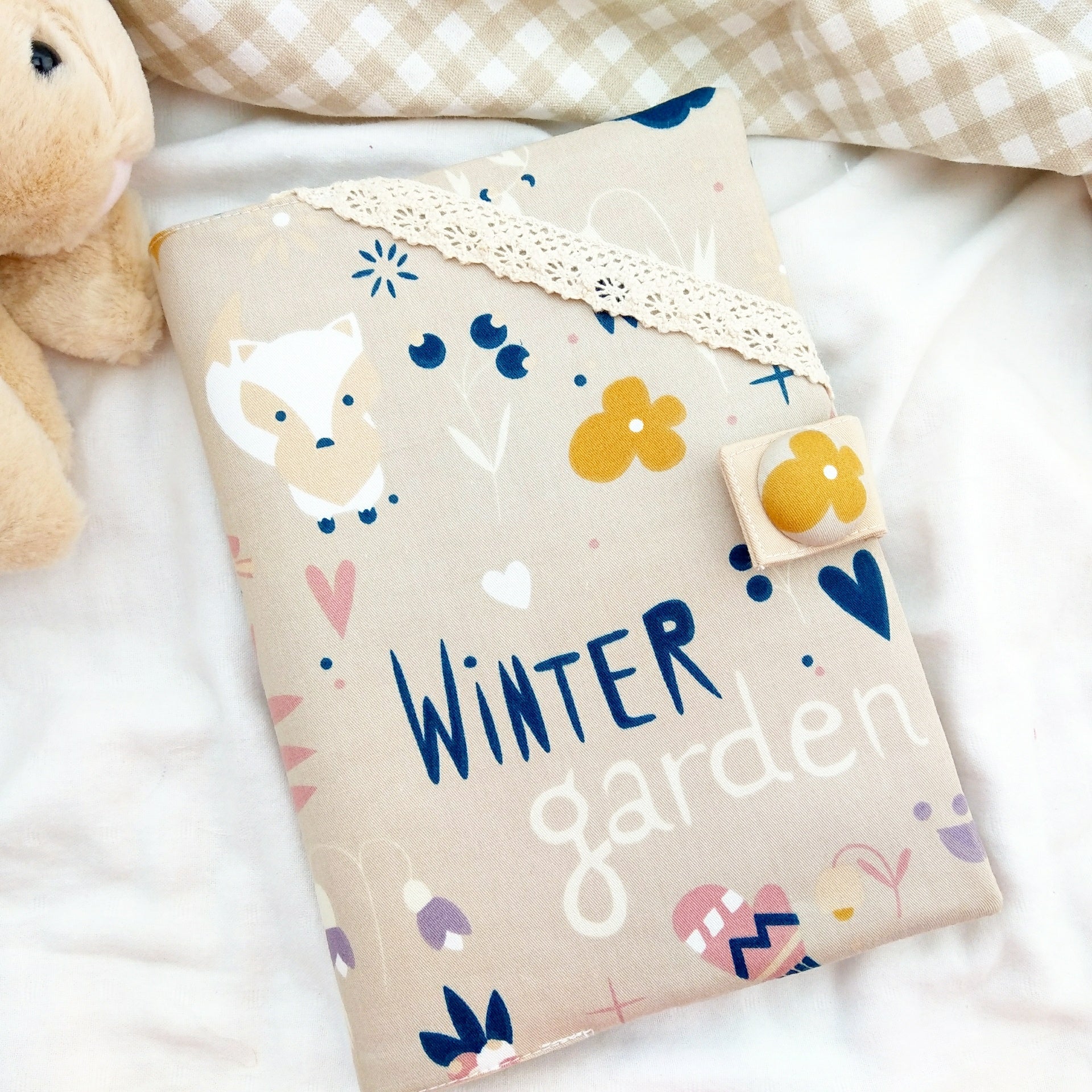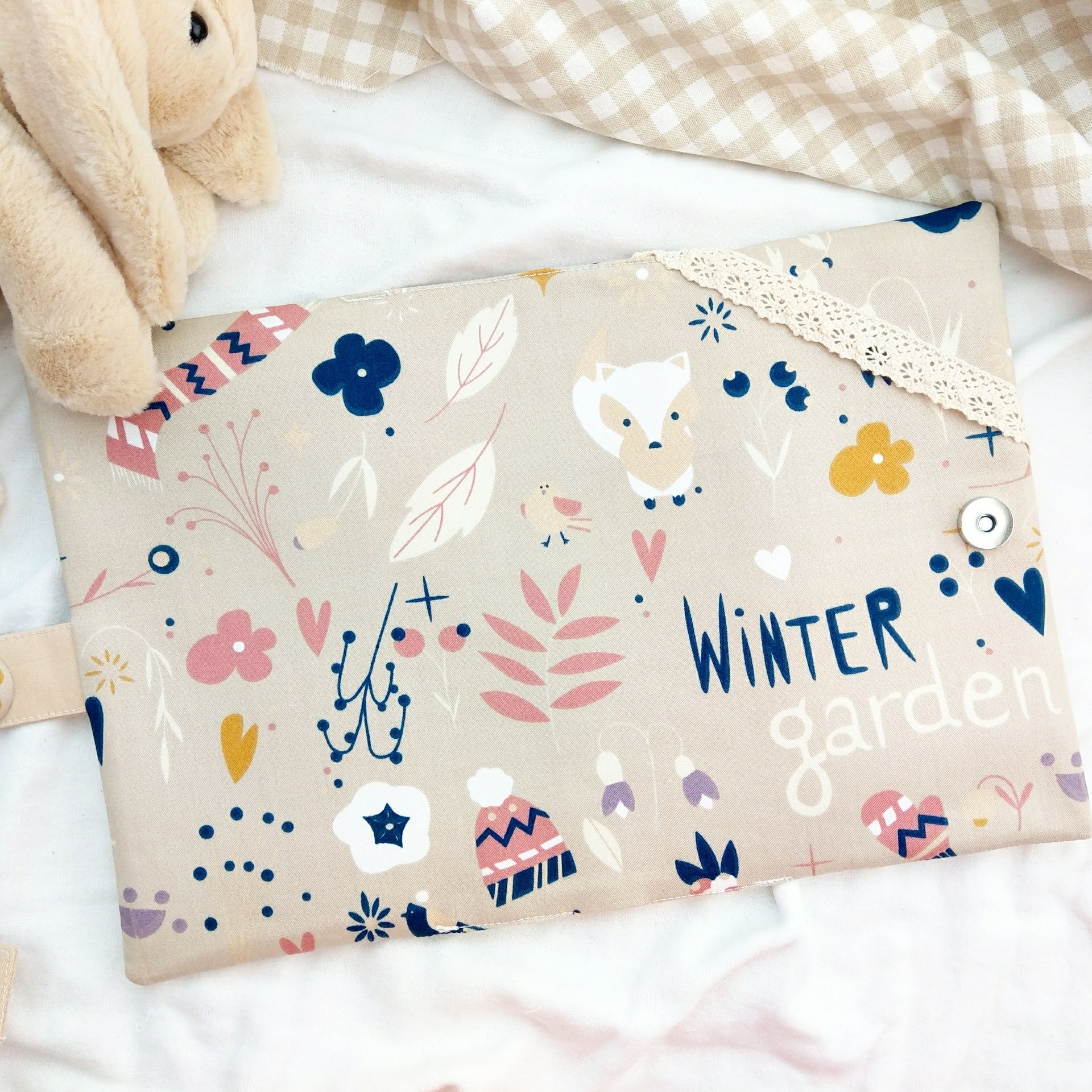 免費繡名字。冬季花園。寶寶手冊布書衣