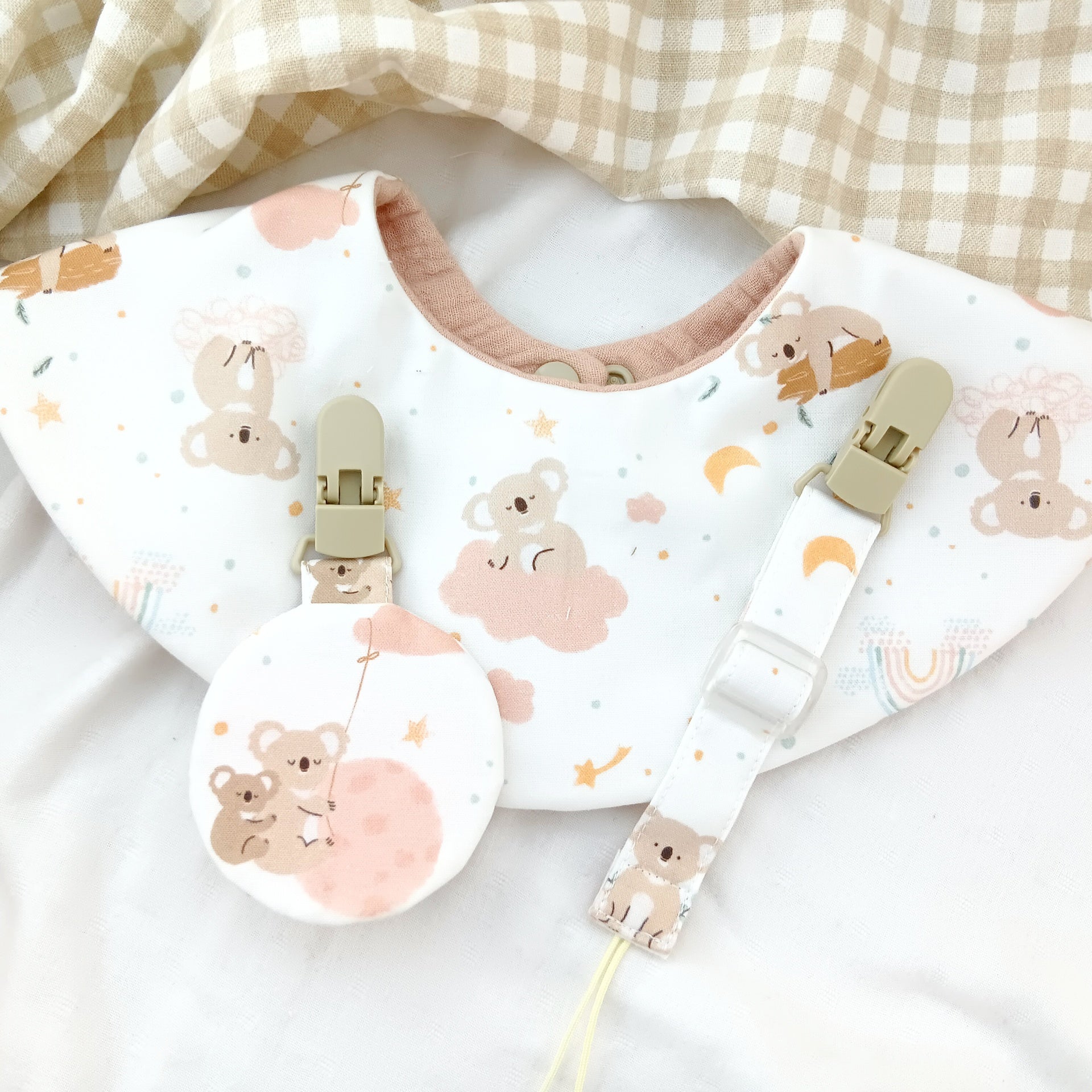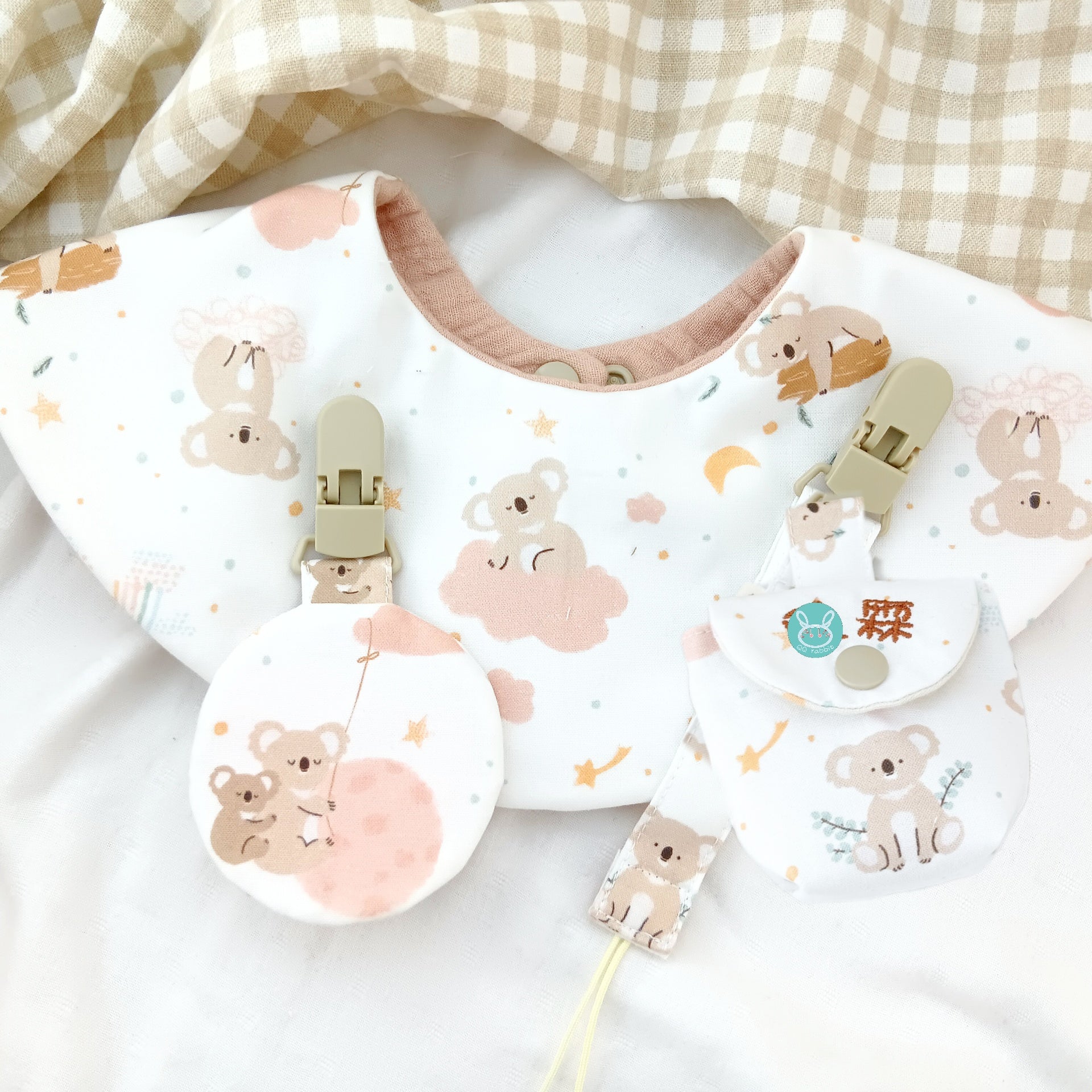 ❤️整組內容:圓形平安符袋+圍兜+奶嘴袋+奶嘴鏈(或可調奶嘴鏈)