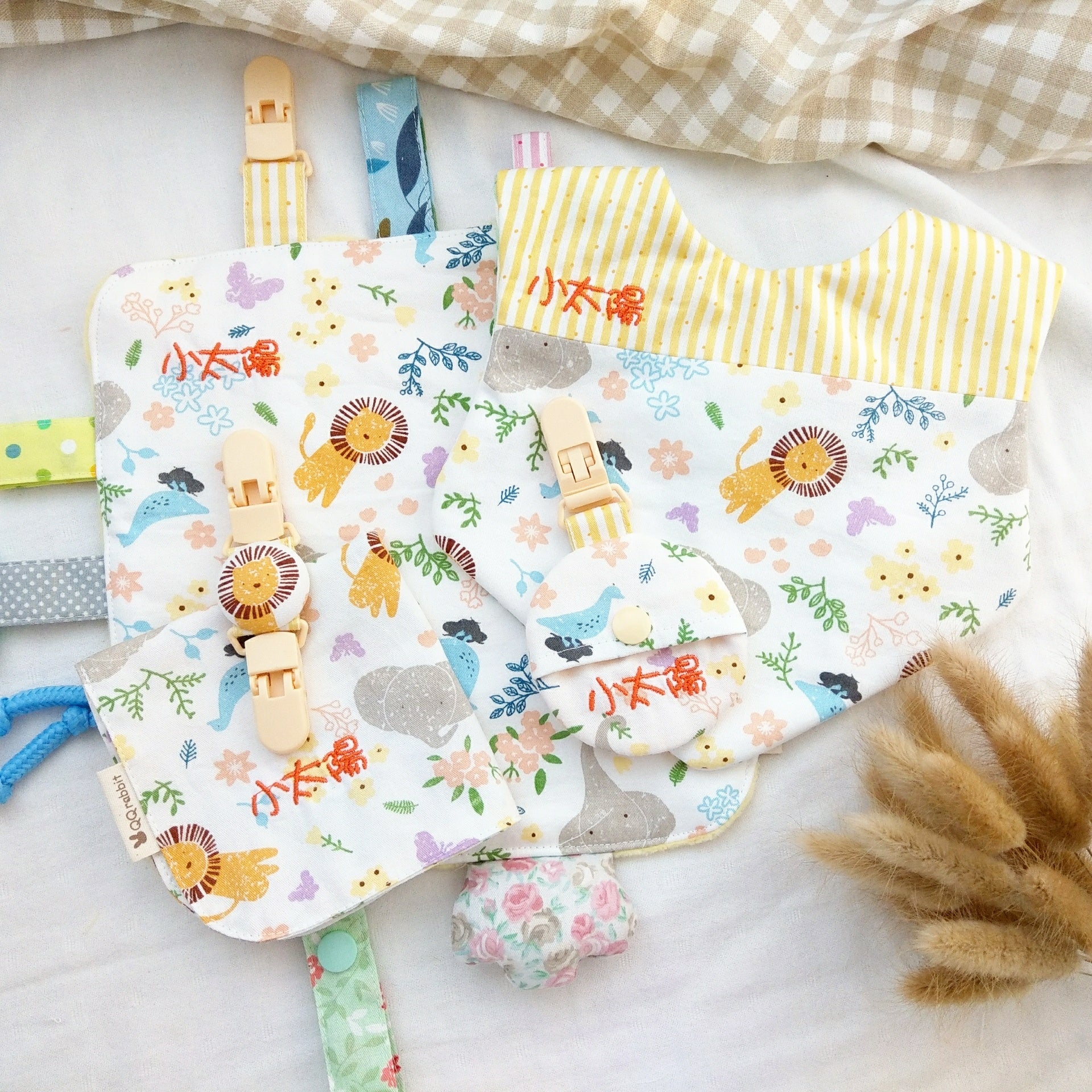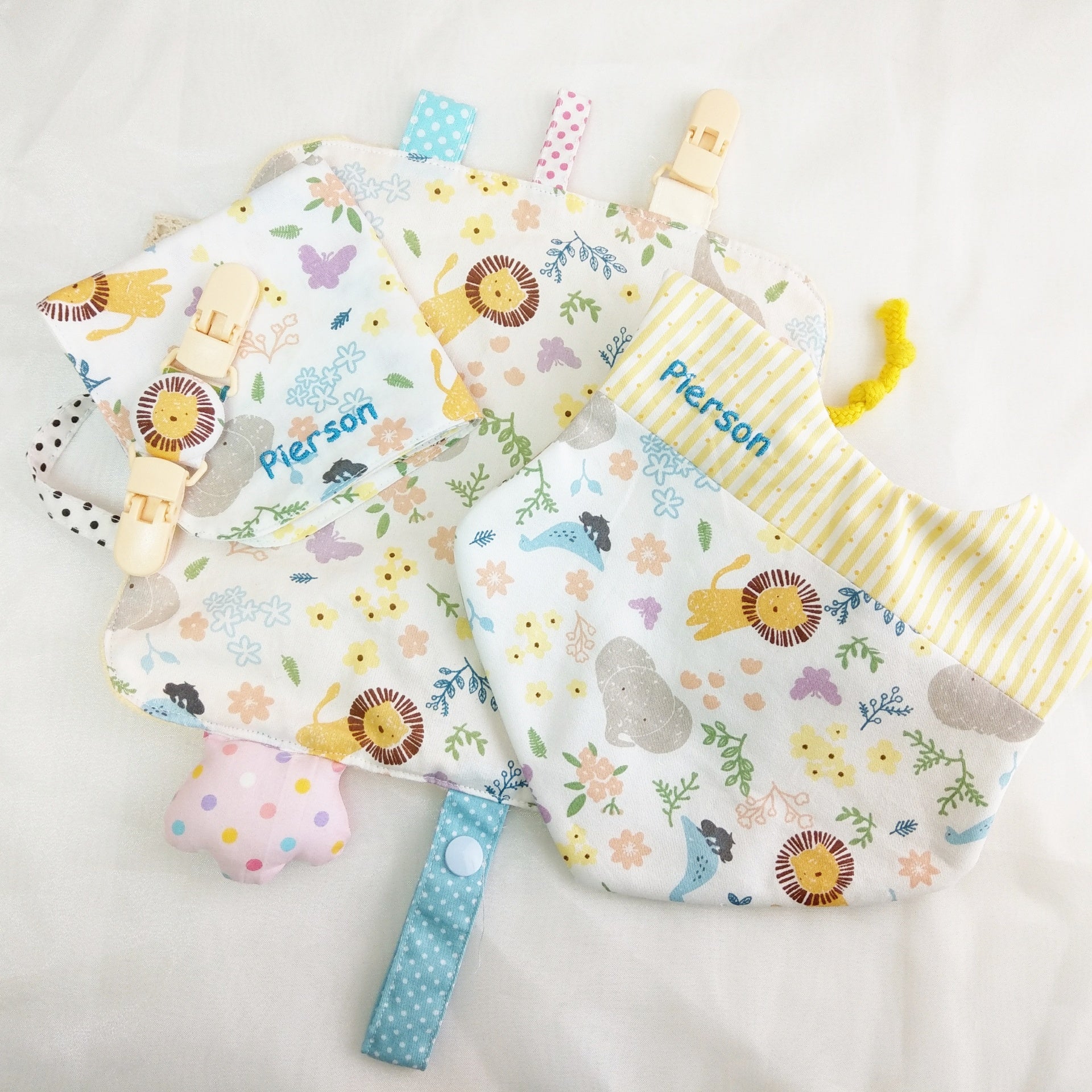 ❤️整組內容:圓形平安符袋+圍兜+手帕+手帕夾+安撫巾
